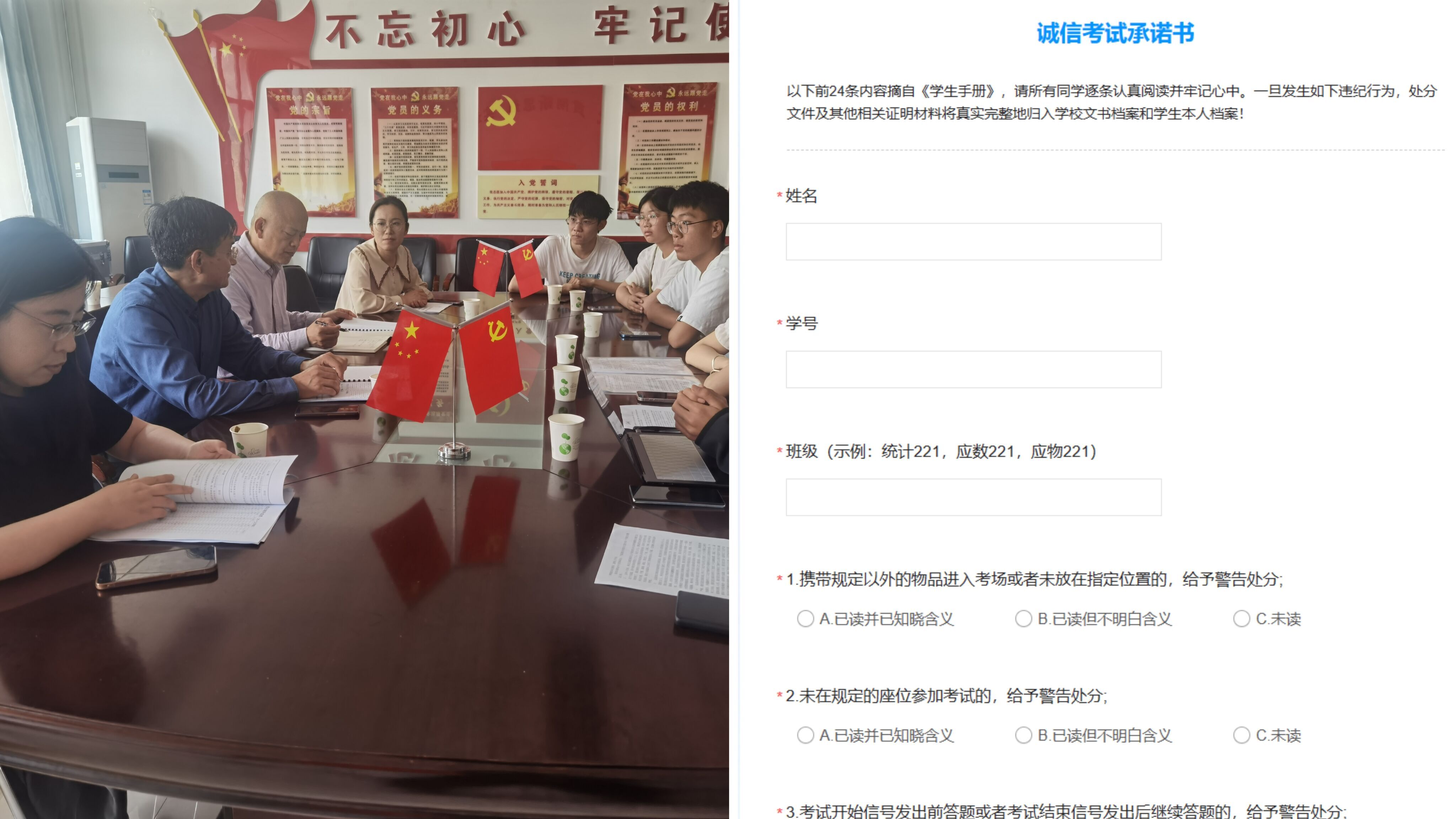 落实承诺践诺,强化责任感。逐个梳理学业预警学生情况,辅导员一对一谈话,根据学生实际情况制作个性化学习方案。学期末,制作带手写签名的电子版诚信考试承诺书并组织全体学生签订,通过承诺践诺的形式引导学生逐项重温学生手册中作弊相关的纪律处分规定,严肃考试纪律,以考风促学风。