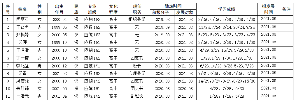 根据本人申请、党组织培养、经8x8x 党委学生党支部研究,拟吸收朱妍臻等11名同志为中共预备党员,现将其有关情况予以公示,公示时间:2021.06.04-2021.06.10,如有异议,请实名致电0532-88958935。