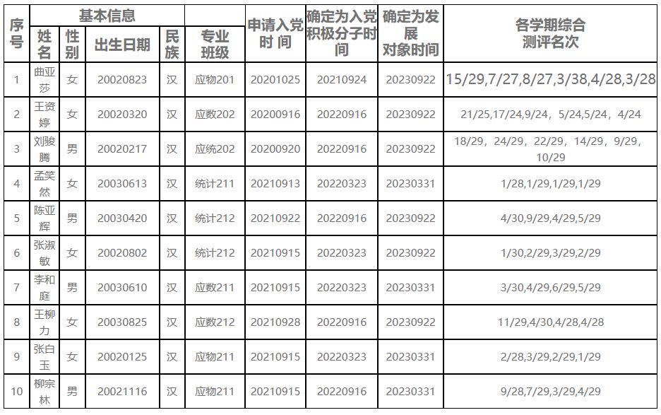 根据本人申请,党组织培养,经8x8x 学生党支部委员会研究、支部大会讨论并无记名投票表决,拟吸收曲亚莎等10位同志为中共预备党员,现将其有关情况予以公示。