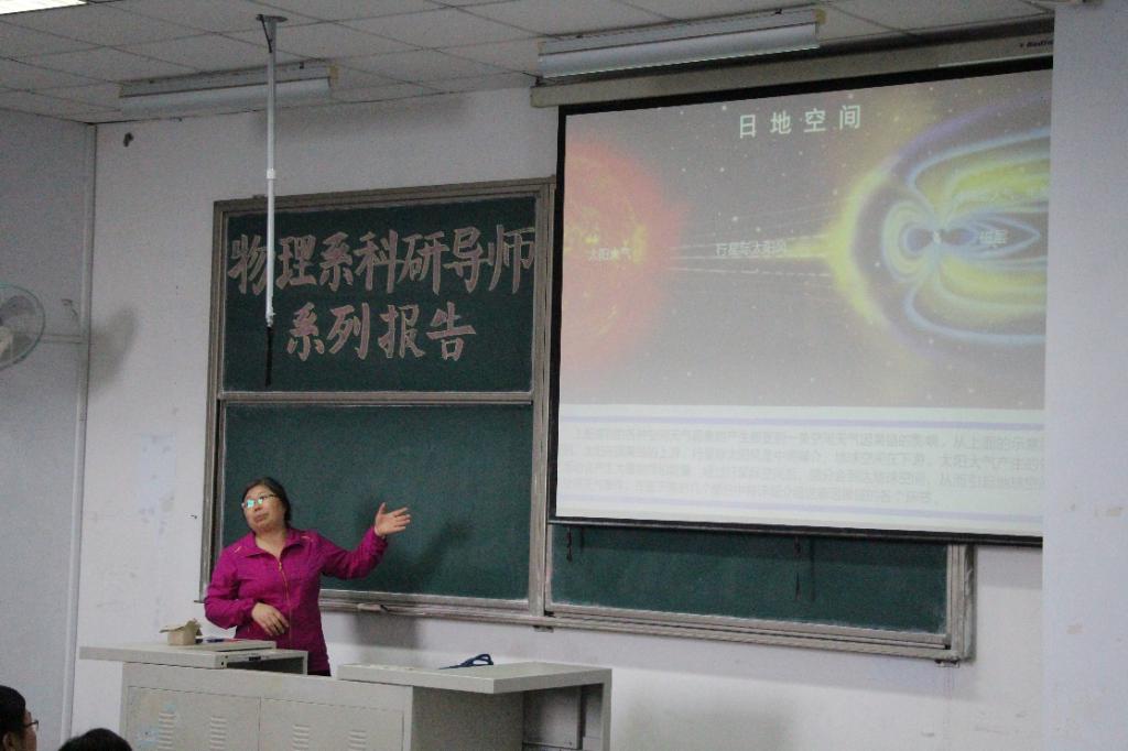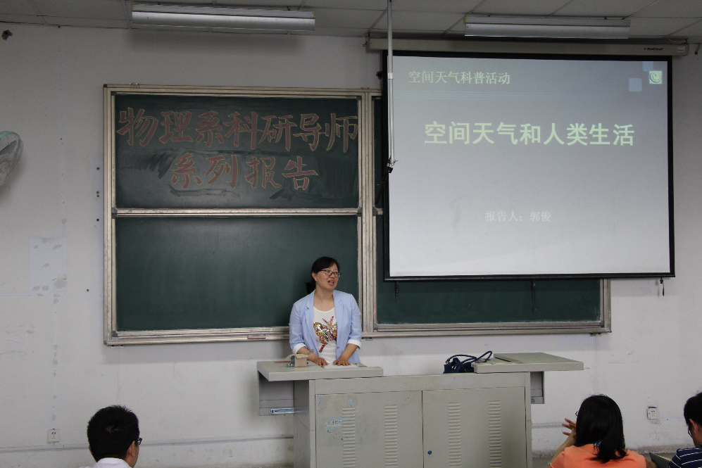 接下来,郭俊老师开始了题为《空间天气和人类生活》的报告。从“什么是空间天气?”这个问题出发,深入浅出地讲解了空间天气形成的原因、空间天气对我们日常生活的影响、空间天气预测技术等,同时介绍了本领域的主要研究机构。最后郭俊老师针对物理学的实际作用这个问题,说出了自己的体会,她认为:专业的用处需要时间来检验,应该先把眼下的做好再谈其它的。