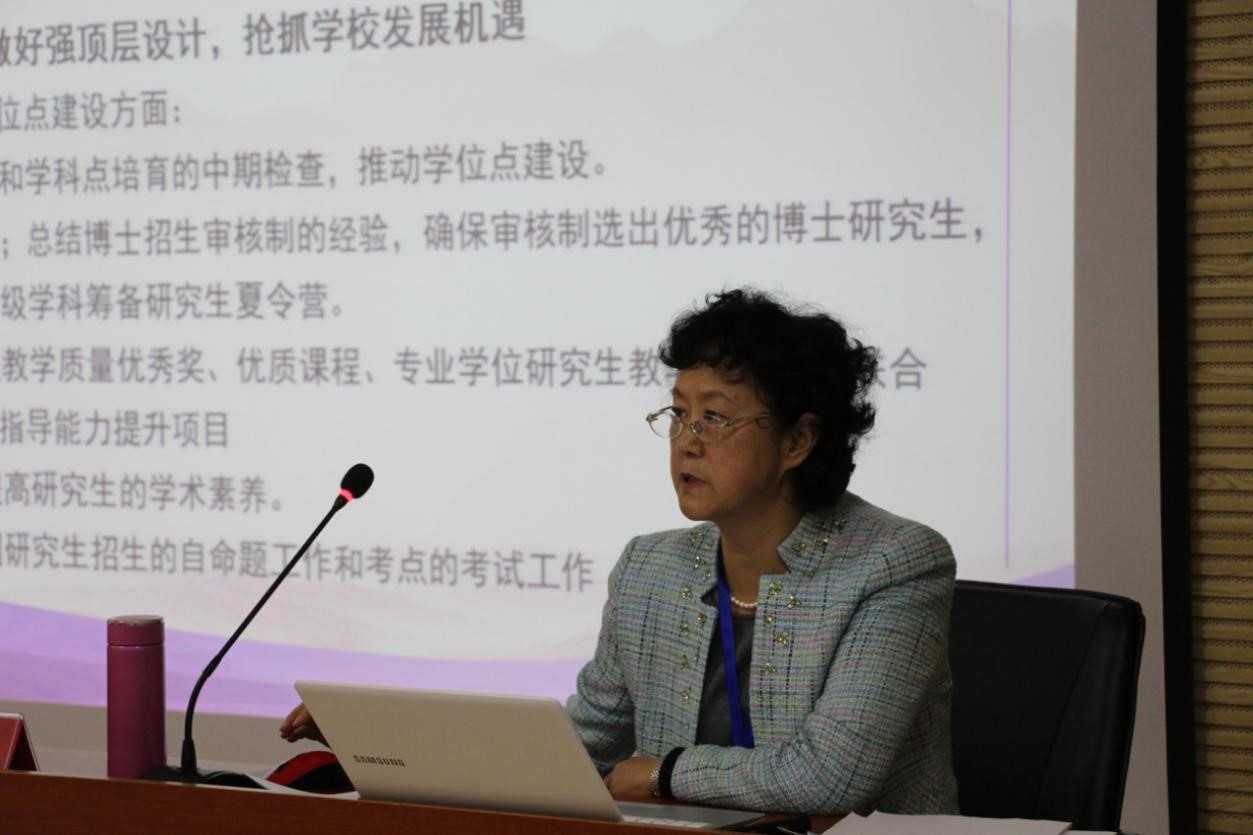 她指出,奉献是中华民族的传统美德,奉献是全人类共同的价值追求,奉献是我们党融入血脉的优秀基因,奉献是学校生生不息的烙印传承。她强调,推进中国特色社会主义伟大事业,必须大力弘扬奉献精神;保持党的先进性和纯洁性,必须大力弘扬奉献精神;形成正气充盈、昂扬向上的社会风气,必须大力弘扬奉献精神;推动高等教育、学校建设高质量内涵式发展,必须大力弘扬奉献精神。她指出,要用理想支撑奉献,用忠诚诠释奉献,用奋斗书写奉献,用淡泊涵养奉献。她强调,要将奉献精神与实际工作紧密结合。结合分管工作,她从本科教学与专业建设、研究生教育与学位点建设等方面,强调了要用开拓创新思维做好强顶层设计,抢抓学校发展机遇;结合联系单位实际,她从改造图书馆电子阅览室、多媒体教室建设、促进研究生导师团队建设、人才培养方案制定、学位点建设等方面,指出要从细处着眼、向实处发力,切实解决困扰师生的痛点、难点、堵点问题。她希望大家能牢记初心使命,大力弘扬新时代共产党人的奉献精神,立足岗位,拼搏进取,为学校高质量内涵式发展不断贡献力量,在矢志教育事业的征程上书写无愧于党和人民的时代篇章。
