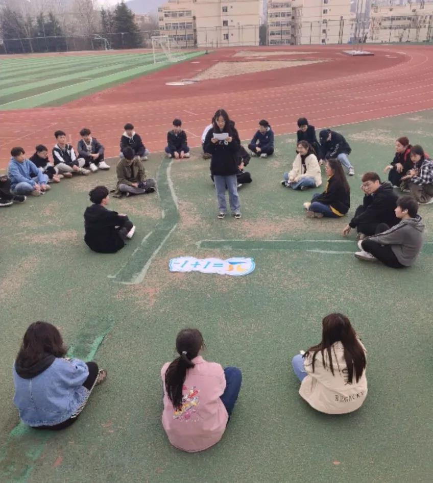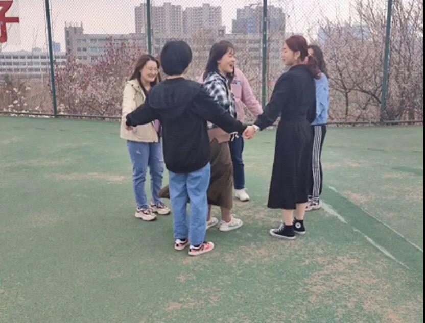 第一个游戏是非常考验同学们之间信任度的游戏——“信任圈”:同学之间需自行组队,每队成员牵手各围成一圈,队内成员依次站到中间,其他成员手拉手围圈,圈内同学闭上眼睛,倒向任何一方,其他成员必须手挽手,给予保护,再将他推回中间的位置。圈内的同学在活动一开始会有些胆怯,但在尝试过第一次后,小组成员就迅速建立了彼此之间的信任。同学们在游戏过程中都很开心,通过这个游戏,让同学们领悟到了合作的重要性,同时也促进了同学们彼此之间的信任。