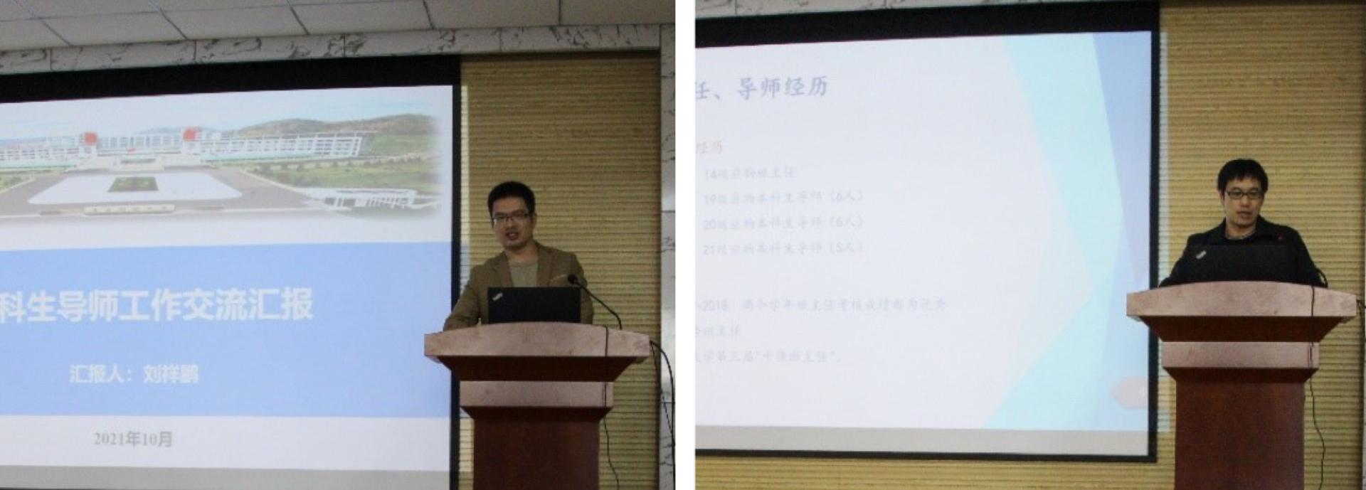 校第三届“十大优秀班主任”高鹏、连续两年考核优秀的导师代表刘祥鹏进行了工作交流。介绍了担任本科生班主任(导师)以来开展的特色工作、取得的成绩及未来工作打算,为在场老师开拓思路,提升视野。
