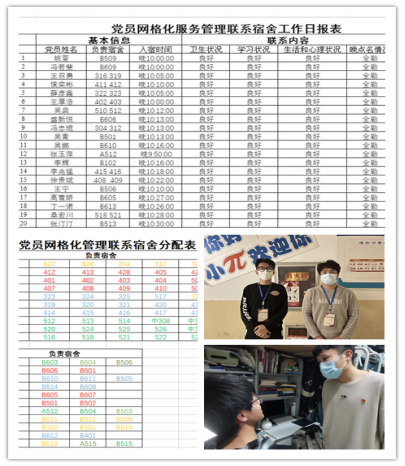 在学校坚决贯彻落实上级决策部署,实行校园封闭管理、线上授课、暂时取消堂食后,宿舍成为学习生活的主要场所。为进一步做好生活服务保障和学生日常管理工作,党员先锋岗实施网格化的服务管理模式,结合楼宇内的各项工作统一为学生党员划分了联系宿舍和责任区,制定了《疫情防控期间党员网格化服务管理实施办法》,学生党员主动当起了联络员、信息员、清洁员,下沉联系宿舍督促同学们完成每日体温自测、健康打卡、晚查寝点名,提醒帮助同学们清理生活垃圾和环境消杀,协助学院精确掌握学生的思想动态、心理状态和实际困难。忙碌而又坚定的身影,是党员先进性最直接、最生动、最鲜活的体现。