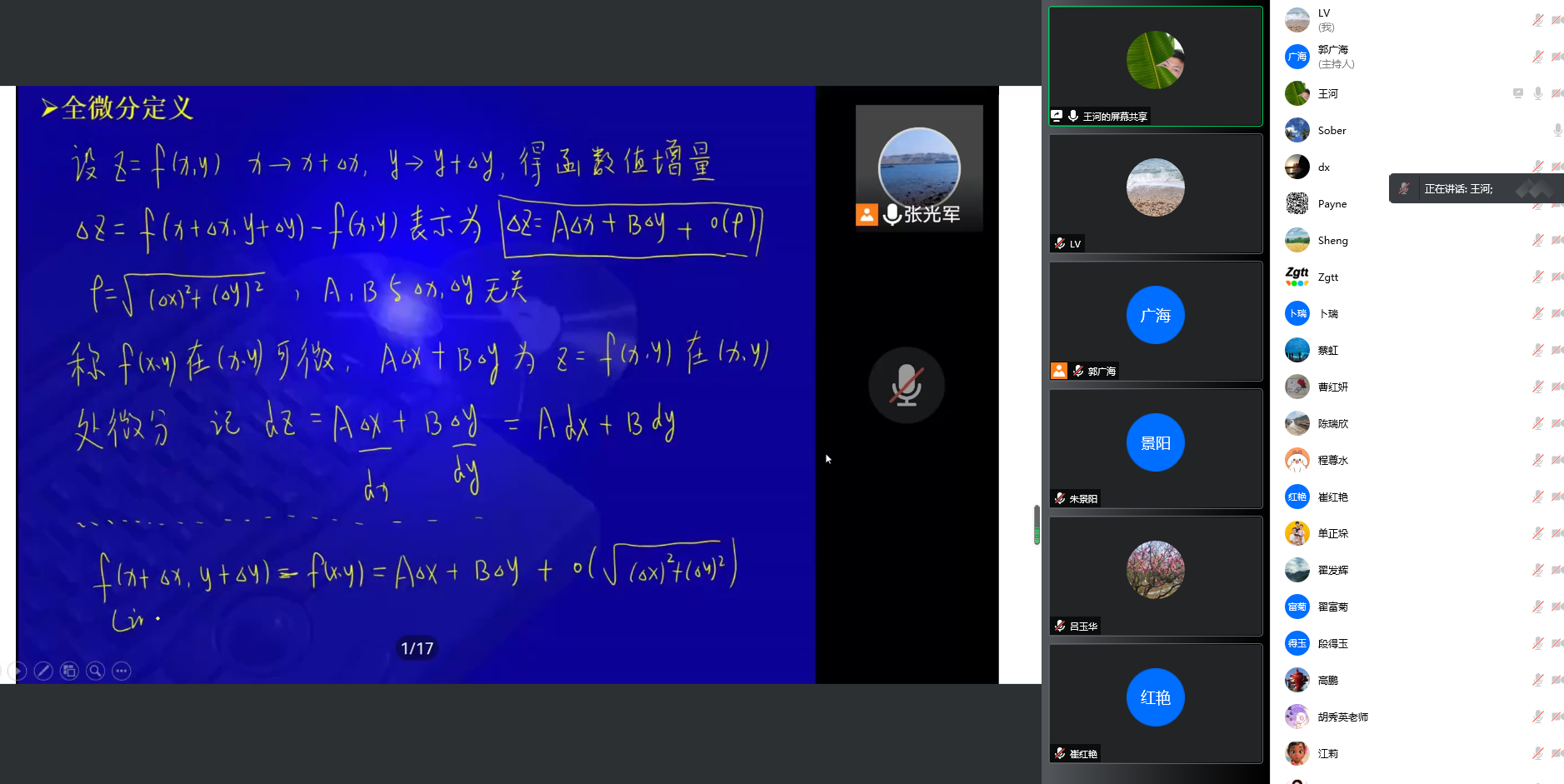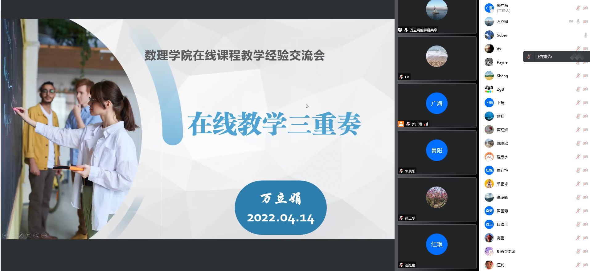 张瑞坤老师以《数学分析》课程为例,介绍了线上教学的“良方妙招”。将更多网络资源融入线上教学过程中,如动画、网页、动图等,形象地把数学教学立体化、让教学效果丰富化。通过随时连麦提问的方式加强教学互动,要求学生在5S内反馈互动,促进教学过程动态化。