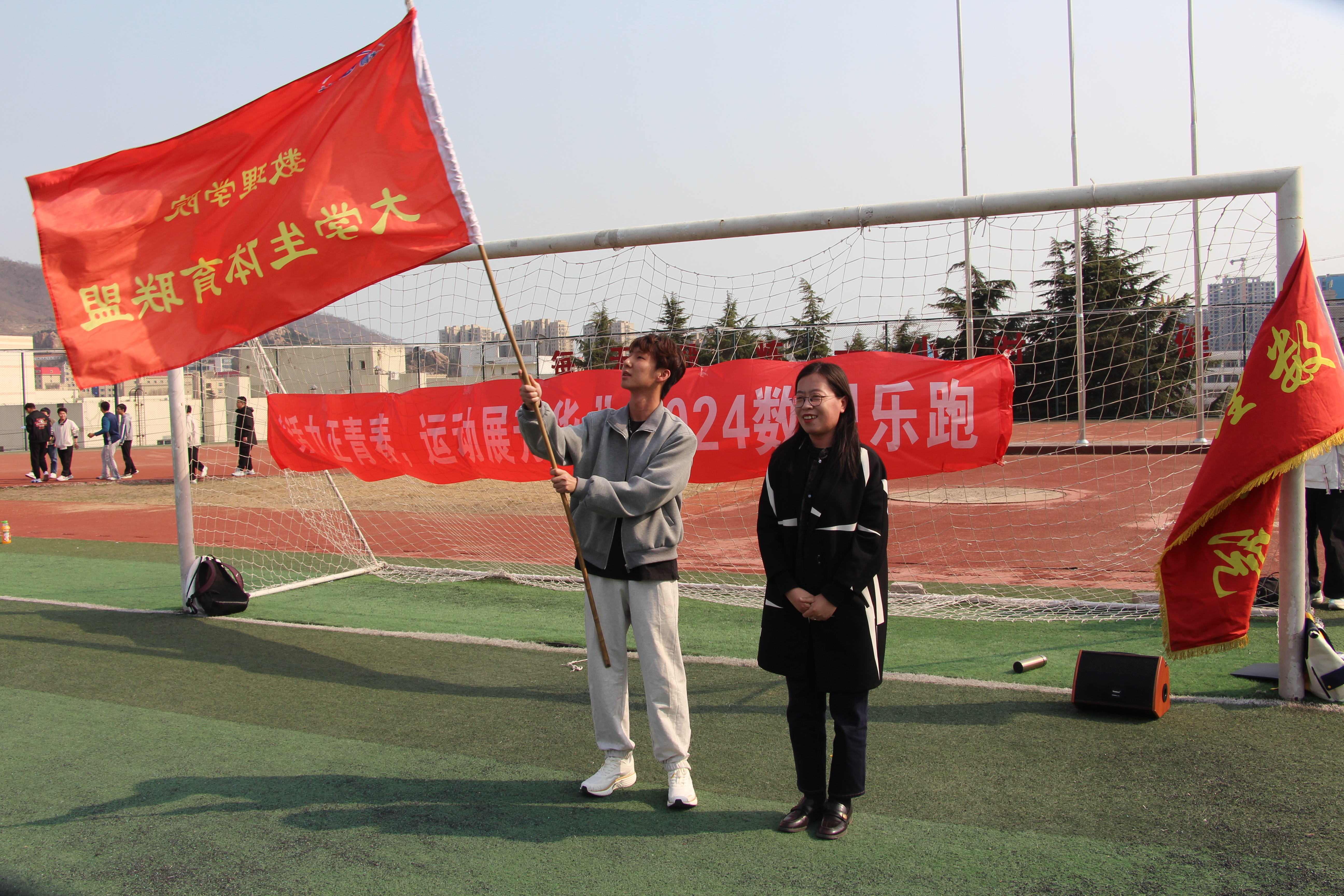 李雯雯为学院体育联盟授旗。往届“运动π”学生代表曹立涛进行宣誓发言,体育联盟指导教师孙建树宣读了《8x8x