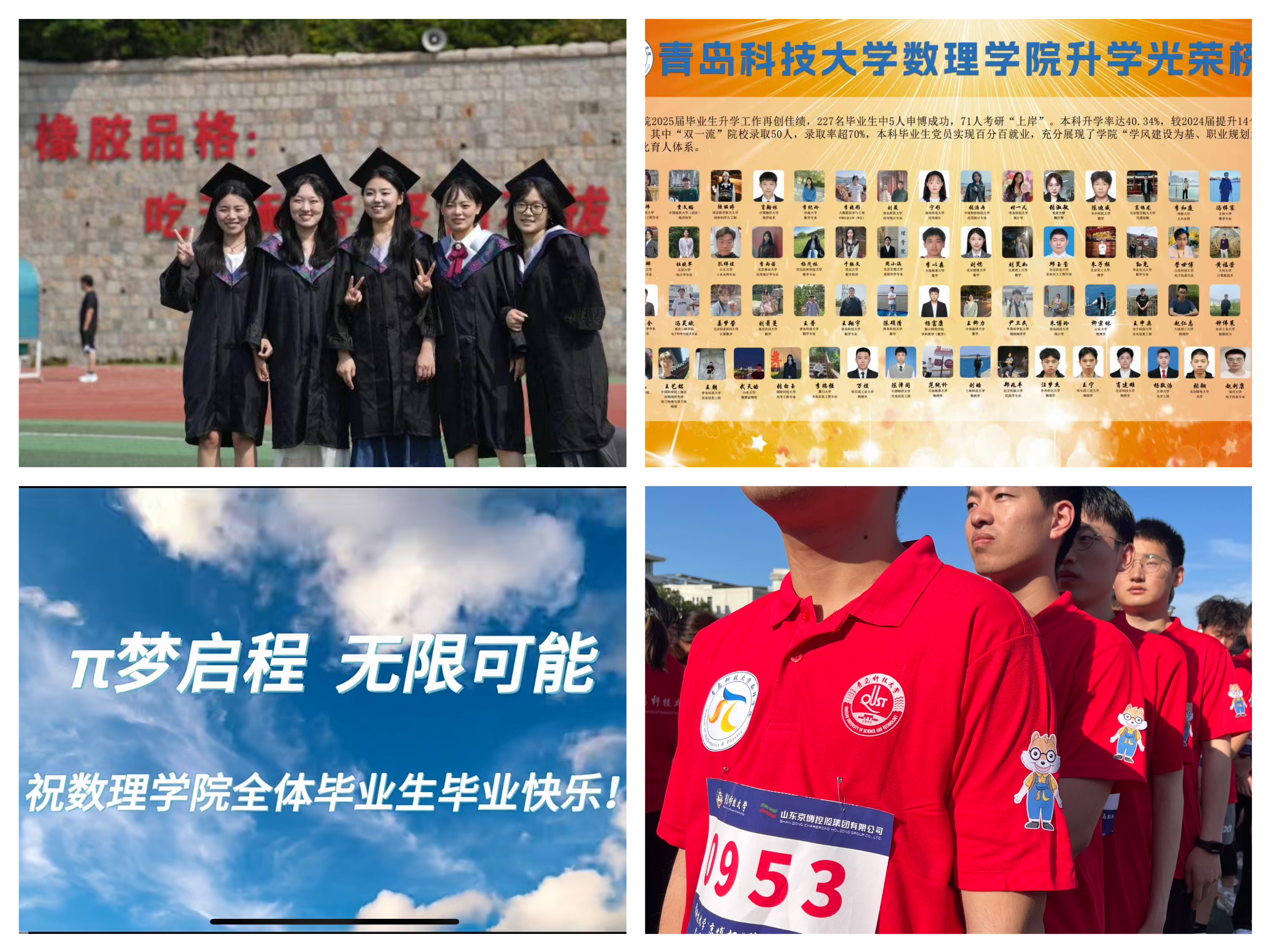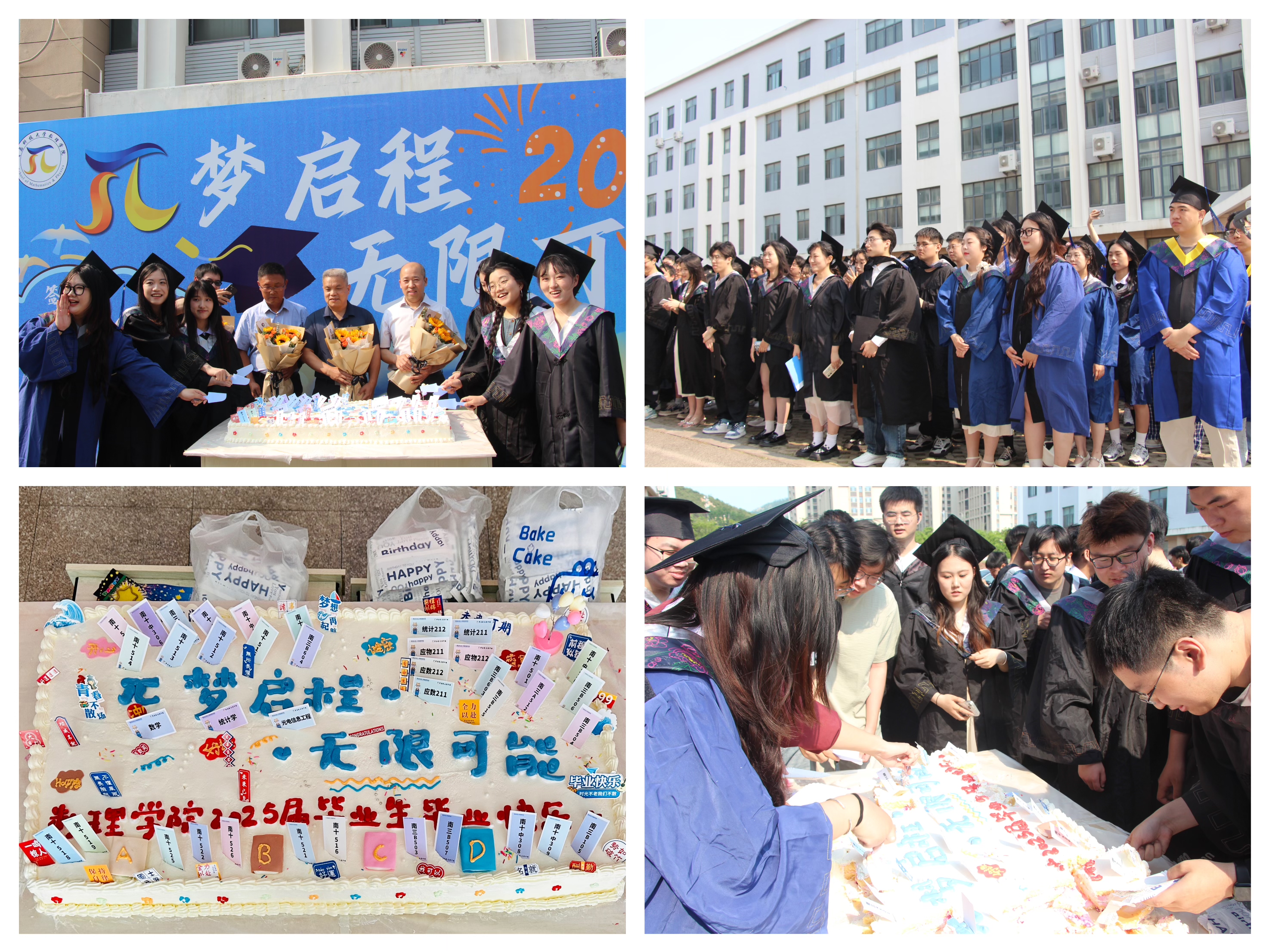 学院在广场举行2025届毕业典礼,现场设置巨型“π”系主题喷绘,以“黄金分割”为设计理念的背景板,将数学之美与育人理念完美融合。典礼上,院长杨树国致辞,勉励毕业生秉持数理人的严谨与创新精神,在人生新阶段勇攀高峰。随后,2025届毕业生“我最喜爱的老师”代表张瑞坤、高鹏发言,向即将踏上新征程的毕业生送上真挚的祝福。学生代表统计211班孟笑然在温暖的发言中表达了对母校的感恩和对未来的决心。毕业生向教师献花致谢,全体师生共同分享印有院徽和毕业生宿舍号码的纪念蛋糕,现场气氛温馨热烈。