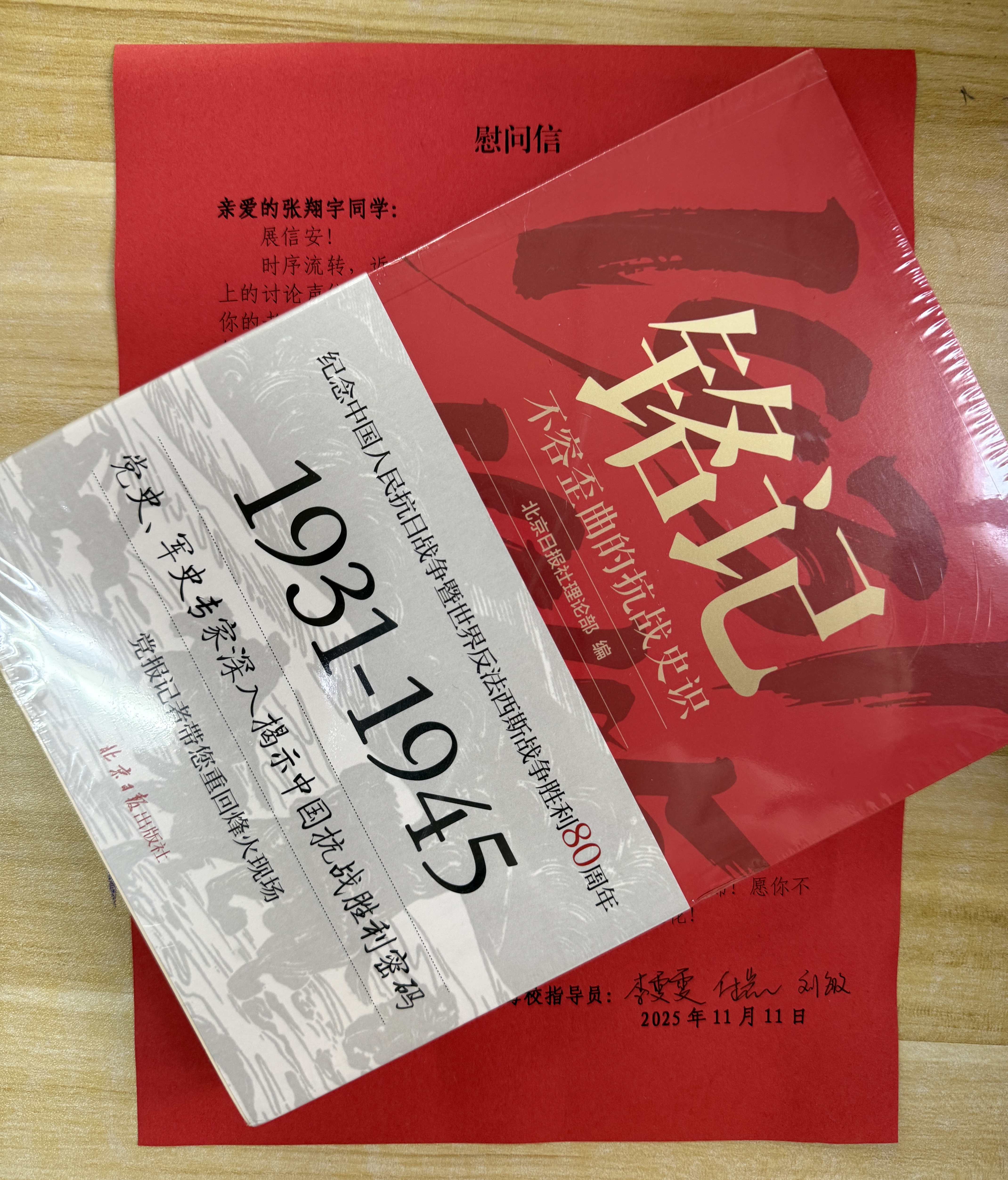 学院“母校指导员”工作小组在前期制定的“一生一策”关怀方案基础上,为张翔宇、张景林精心准备了一份特殊的“精神食粮”礼包。礼包中包含一套《铭记》抗战书籍,并附上了一封由学院副书记、辅导员、征兵工作联系人等“母校指导员”队伍联名撰写的慰问信,字里行间充满了师长们的牵挂与鼓励,肯定了他们的成长与选择,并承诺学院将持续作为他们坚实的后盾。