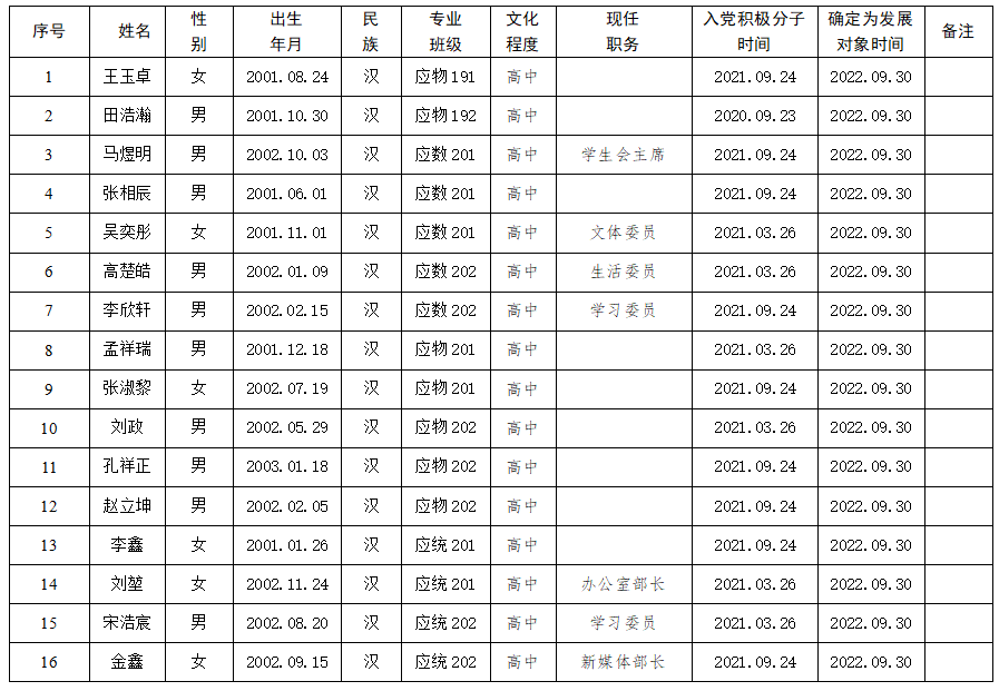 经8x8x 学生党支部研究讨论,8x8x 党委审核,拟确定王玉卓等16名同志为党员发展对象,现公示如下,如发现公示对象有不符合党员条件方面的问题,可在公示期内实名反映。