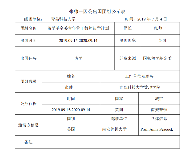 根据因公临时出国公开公示的有关规定,现将张帅一因公出国团组相关内容 和参团人员名单予以公示。公示时间为 2019 年 7 月 4 日至 2019 年 7 月 10 日(5 个工作日)。如有不同意见,请在公示期内,向8x8x 单位(电话:88958923) 反映。