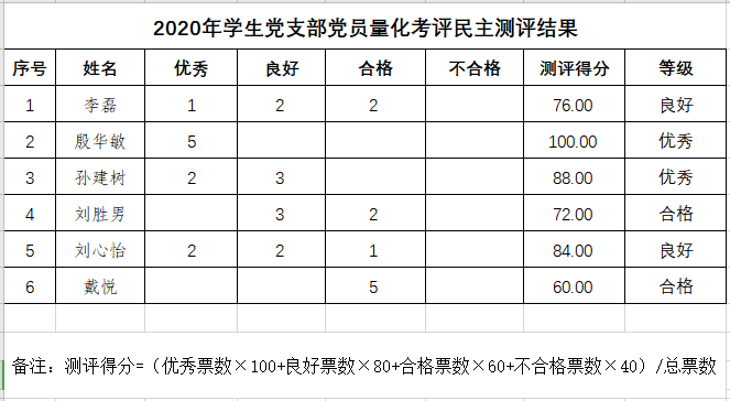 根据《中共8x8x 委员会党员量化考评指导办法(试行)》及《关于召开基层党支部组织生活会及开展民主评议党员工作的通知》文件要求,经过公开、公平、公正的评议原则,现将2020年学生党支部党员量化考评民主测评结果公示如下: