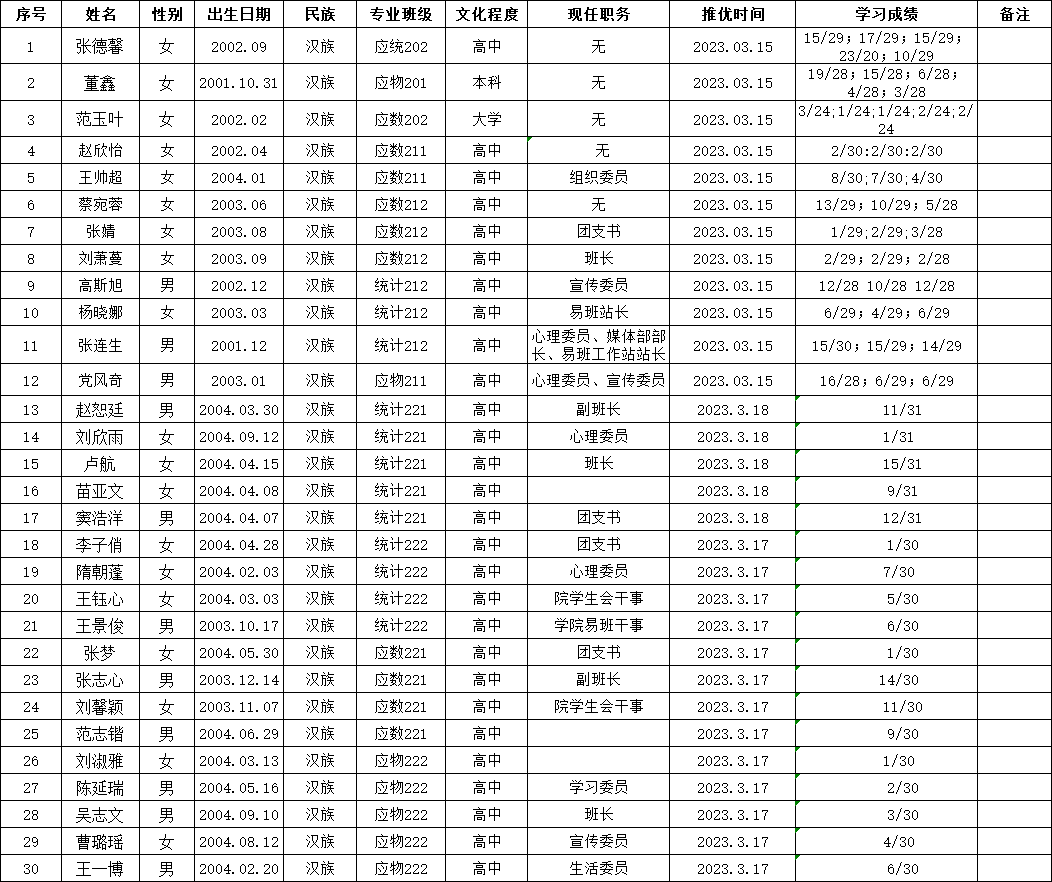 经8x8x 本科生各团支部全体团员大会讨论推荐,8x8x 团委研究决定,拟定推荐张德馨等30名同学为入党积极分子,现公示如下,如有异议,可在公示期内来电反映。