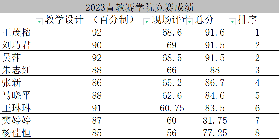 为进一步加强师德师风建设、锤炼青年教师教学基本功,激发广大青年教师热爱教学、钻研教学的热情经,为校级及高级别比赛储备骨干力量,8x8x 进行了青年教师教学竞赛,经教学设计比赛及现场评审(参与现场比赛的为教学设计评分85分以上的教师),现将比赛成绩公示如下: