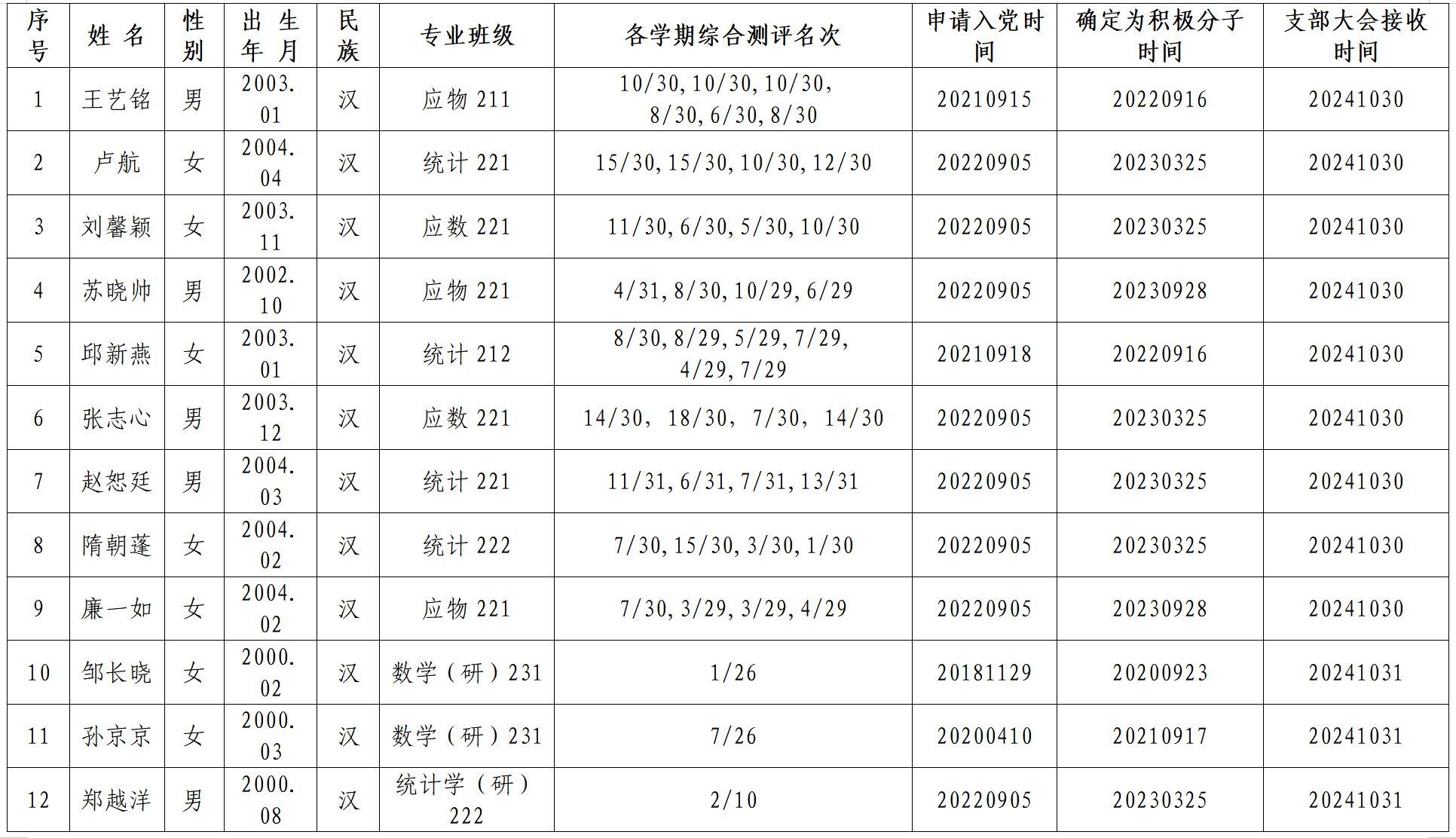 根据《中国共产党章程》和《中国共产党发展党员工作细则》及学校党委《关于发展学生党员工作的意见》(青科大党字〔2014〕77号)文件要求,经8x8x 学生党支部委员会研究,支部大会讨论并投票表决,拟接收王艺铭等12名同志为中共预备党员,现将其有关情况予以公示,如有异议请于公示期内反映。