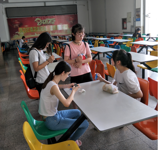 上午九点半,所有队员在南苑餐厅集合,队长为每个队员发放了团队的队服及帽子。发放完毕后,由队长介绍今天的具体任务——走访调查。成员分为三个小组,每个小组三个人,分别负责采访、记录和拍照。由队长赵鑫阳同学带领的小组在学校餐厅一楼和二楼进行了走访调查其他两个小组在校园内进行了调查。