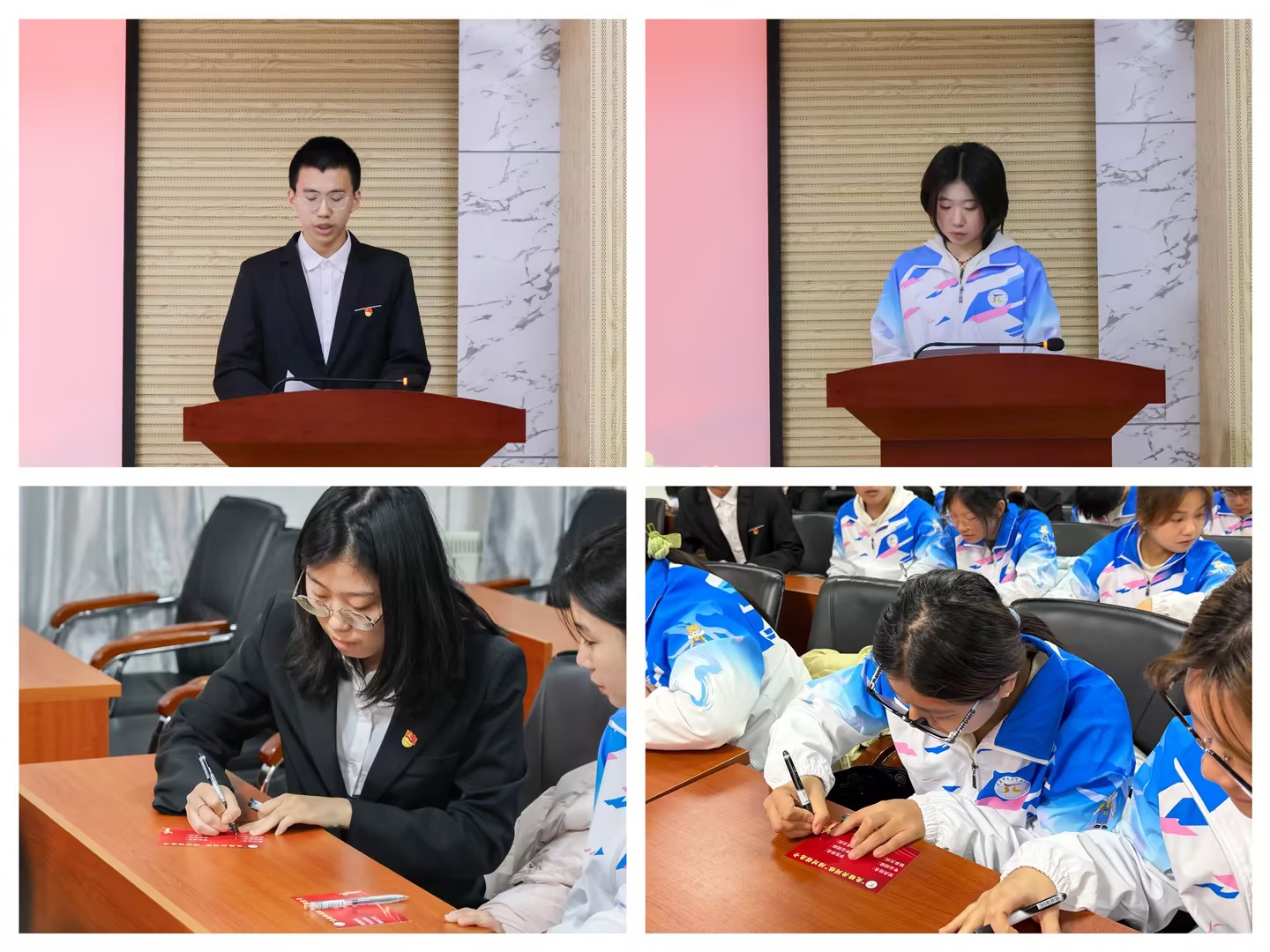 在经验交流环节,五星级结对党员代表统计221班张宸萱结合自身实践,生动分享了在思想引领、学业帮扶、生活关怀等方面的具体做法与心得体会,为在场的结对党员提供了宝贵借鉴。新发展党员代表应数231班马振鹏作了表态发言,表达了全体新发展党员积极服务同学、做好“传帮带”的决心。结对新生代表应物252班张洋洋真诚感谢党组织的关怀和学长学姐的帮助,并发出了向党员同志看齐、努力成长成才号召最后,在与会师生的共同见证下,新一批结对党员与结对学生郑重签署了“结对联系卡”,正式确立帮扶关系,架起一座传递温暖与力量的桥梁。