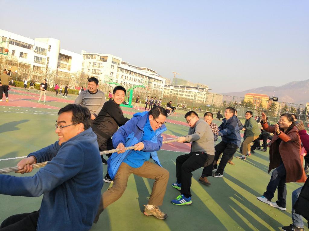 比赛的第一个项目是拔河,比赛分男女教职工分别进行。在比赛正式开始之前,老师们先是简单的热身,彼此之间交流一下最近的身体状况。热身后,在裁判员的一声令下,比赛开始,大绳两边选手双手紧攥,用力往后拉。受人数限制没有上场老师们更是激情澎湃,身体恨不能随绳而动,努力胡喊齐号子。尤其是女老师们也都抛却了平时的优雅和矜持,真是用尽了最大的力气。