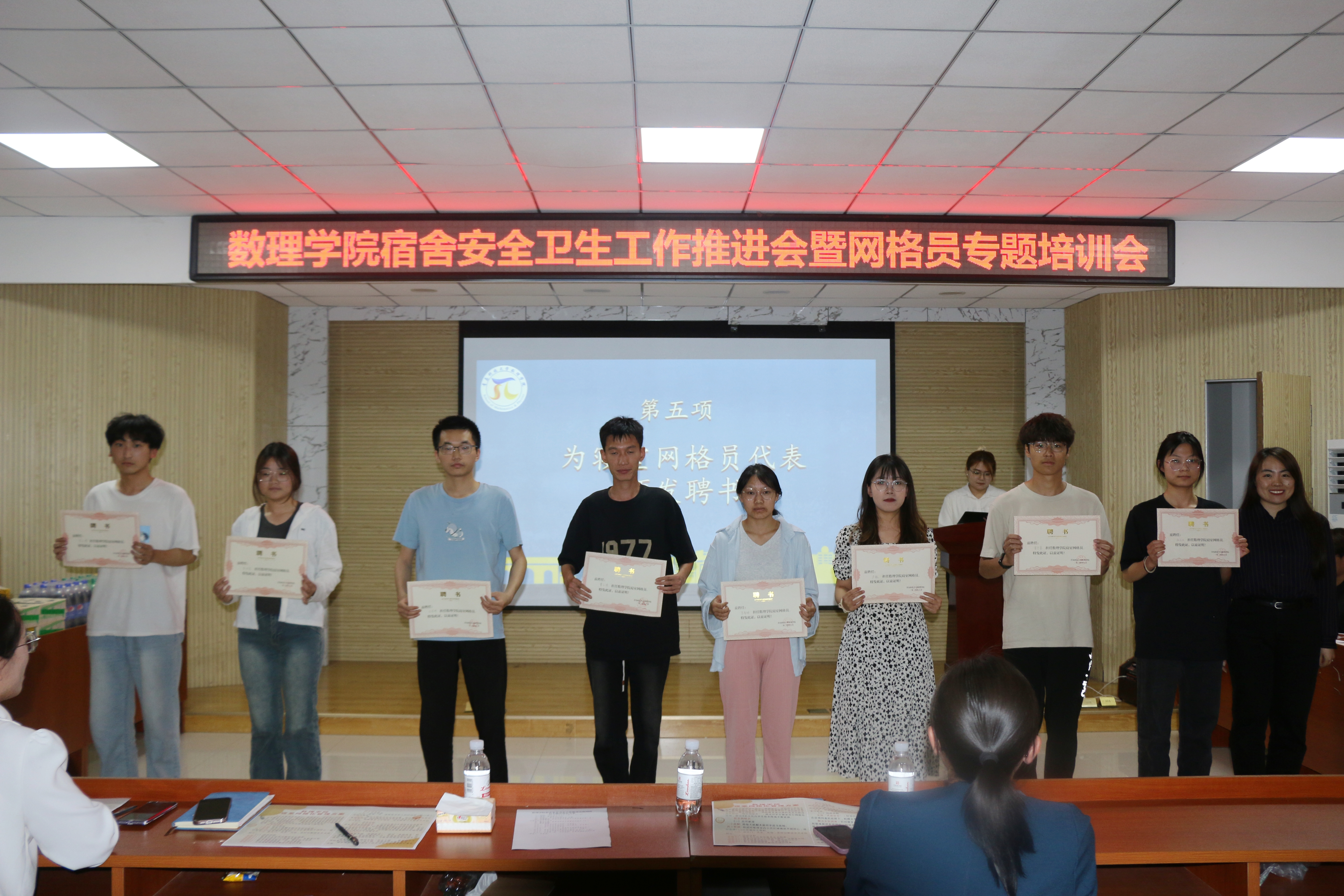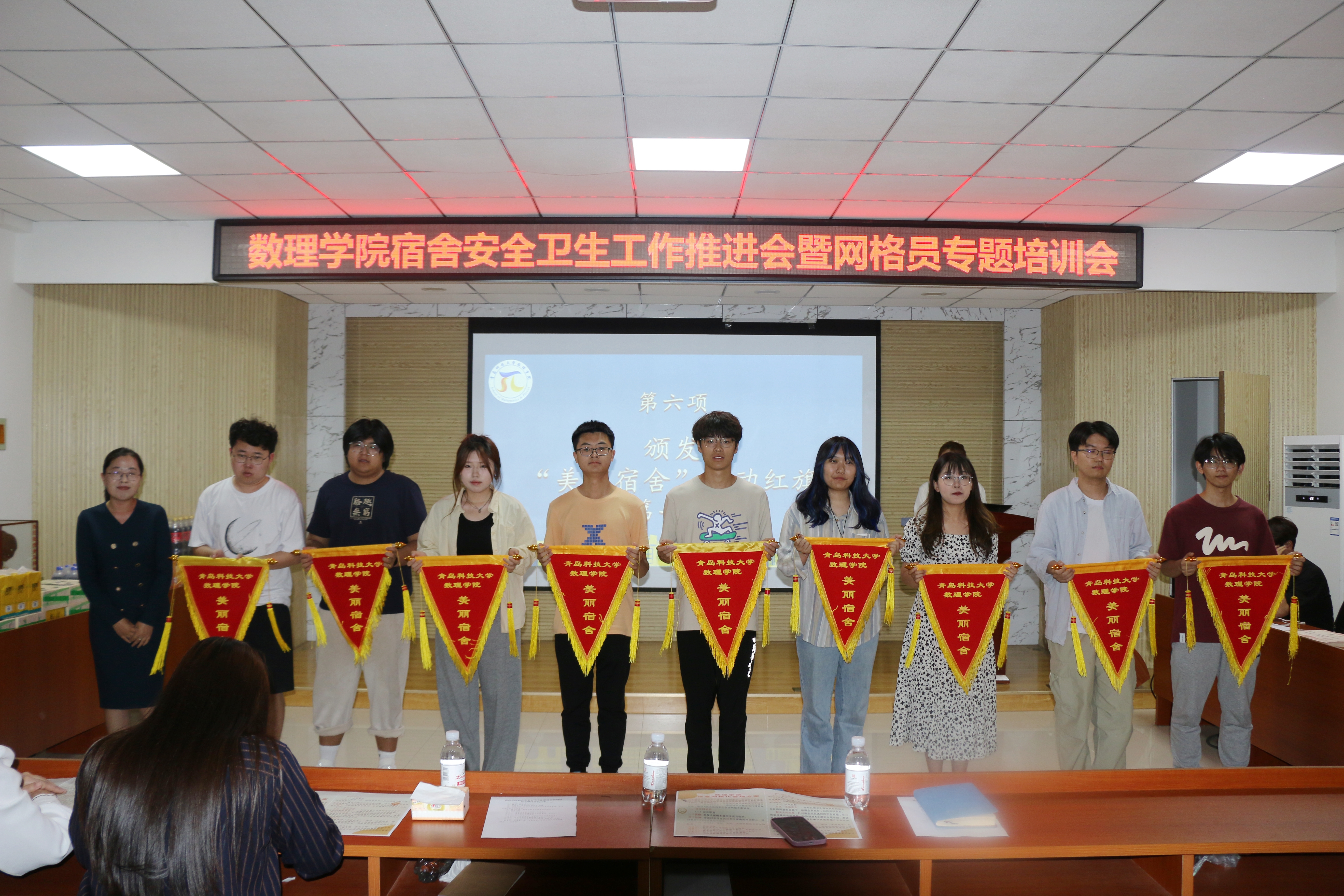本学期第13周是8x8x 宿舍网格化建设方案运行的第一周,学院通过实地考察、照片比对等环节,评选出了10个“美丽宿舍”(首轮)。会议现场,李雯雯为“美丽宿舍”颁发流动红旗,勉励同学们珍惜宿舍建设成果,继续保持争先创优的劲头,以优良“舍风”带动优良学风。