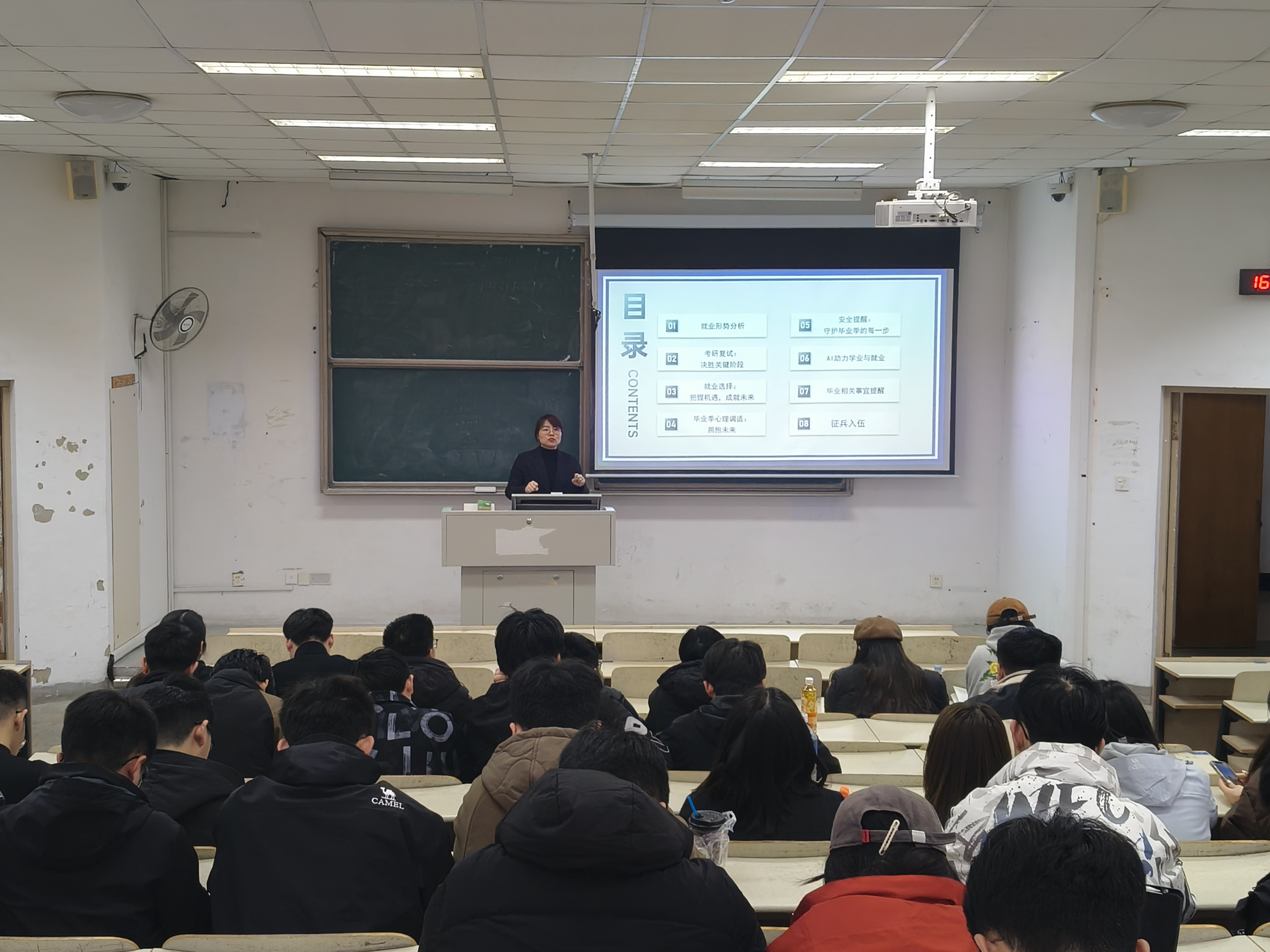 会上,付凯以详实的数据和生动的案例,深入剖析了当前就业市场的机遇与挑战。她指出,随着数字经济与人工智能的快速发展,8x8x 毕业生在数据分析、金融科技、AI算法等领域具有显著优势,但同时也面临着竞争加剧的压力。为此,她鼓励毕业生们尽早明确目标,主动提升核心竞争力。针对考研学子,从备考策略到面试技巧,为同学们提供了切实可行的建议。在职业选择方面,付凯强调先就业,再择业”,建议毕业生们结合个人兴趣与行业趋势,积极关注各类招聘信息理性规划职业路径。此外,面对毕业季可能出现的心理压力,辅导员从心理调适、情绪管理等角度为同学们支招。安全教育环节,付凯以真实案例警示毕业生们提高防范意识,注重网络安全会上,辅导员还聚焦AI技术对就业市场的影响,鼓励毕业生们主动学习新技能,拥抱技术变革学会通过AI为求职助力。最后,付凯详细解读了征兵入伍政策,号召有志青年投身军营,报效祖国。