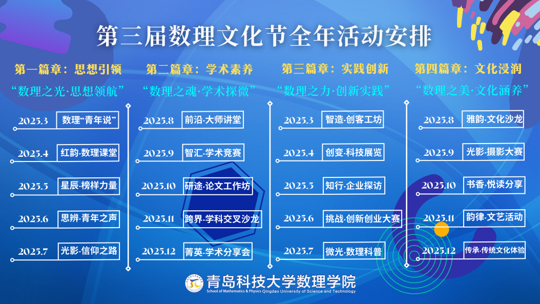 开幕式上,第三届数理文化节年度活动方案正式发布。围绕“思想领航”“学术探微”“创新实践”“文化涵养”四大篇章,本届文化节涵盖“学科交叉沙龙”“智汇学术竞赛”“企业深度探访”等20项主题活动,面向全校开展,时间贯穿全年。
