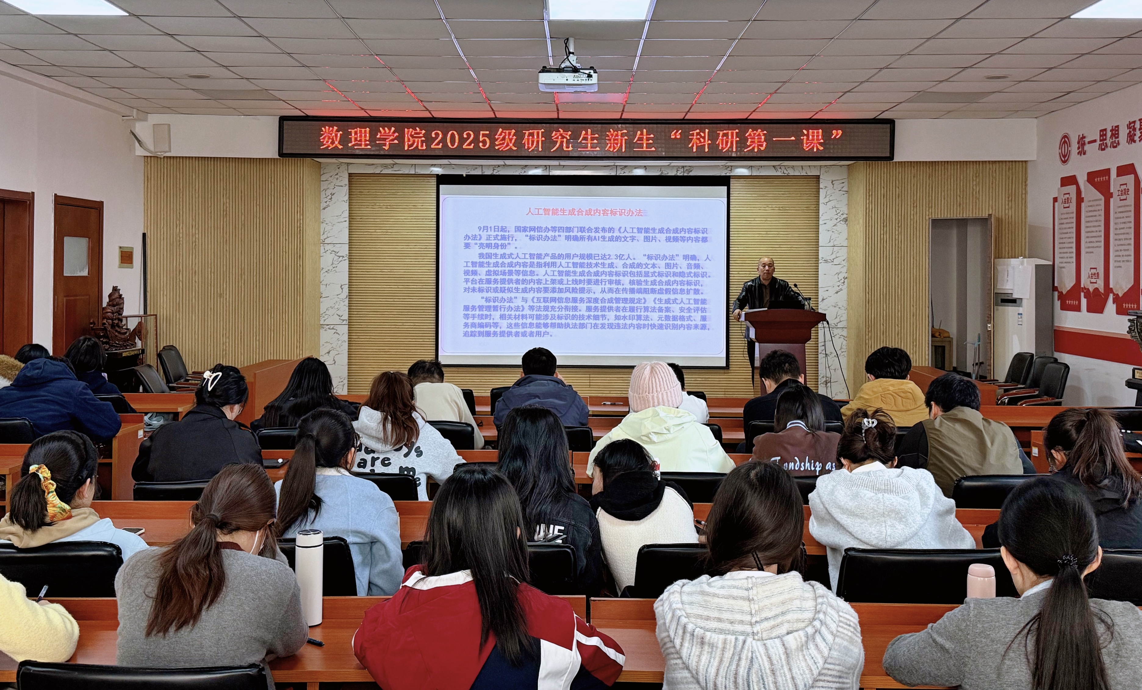 杨树国作题为“恪守科学道德,坚决杜绝学术不端行为”专题讲座,结合数理学科的科研特点与国内外学术界的典型案例,深刻剖析了学术不端行为的各种表现形式及其带来的严重危害,为同学们划清了学术研究的“红线”与“底线”。他强调,研究生教育是培养高层次创新人才的重要途径,学术诚信则是学术创新与发展的基石,全体新生从入学起就要树立起崇高的科学道德观,将学术规范内化于心、外化于行,在未来的科研道路上,既要勇于探索、敢于创新,更要敬畏规则、坚守底线,努力成长为一名德才兼备、堪当大任的优秀科研人才。讲座内容丰富、论述精辟,既有理论高度,又富有现实指导意义,在现场新生中引起了强烈反响和深刻思考。